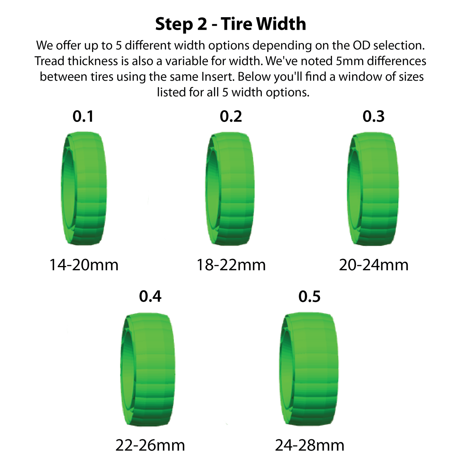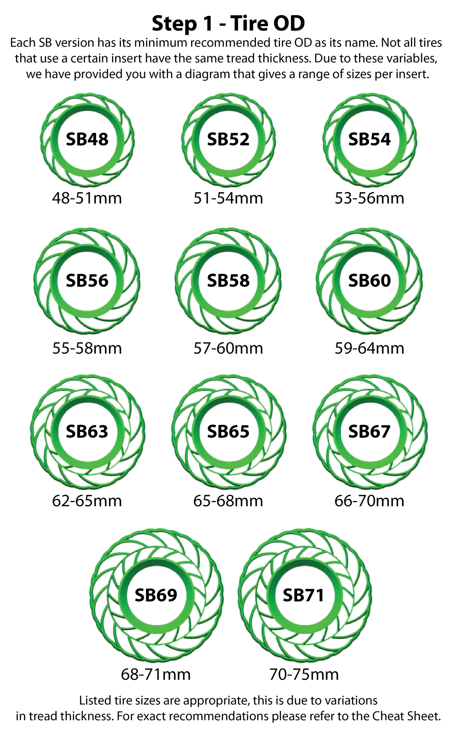 Our new sizing system is based off tire size. Each SB version has its minimum tire size as its name. Not all tires that use a certain insert have the same tread thickness. Due to these variables, we have provided you with a diagram that gives a range of sizes per insert.