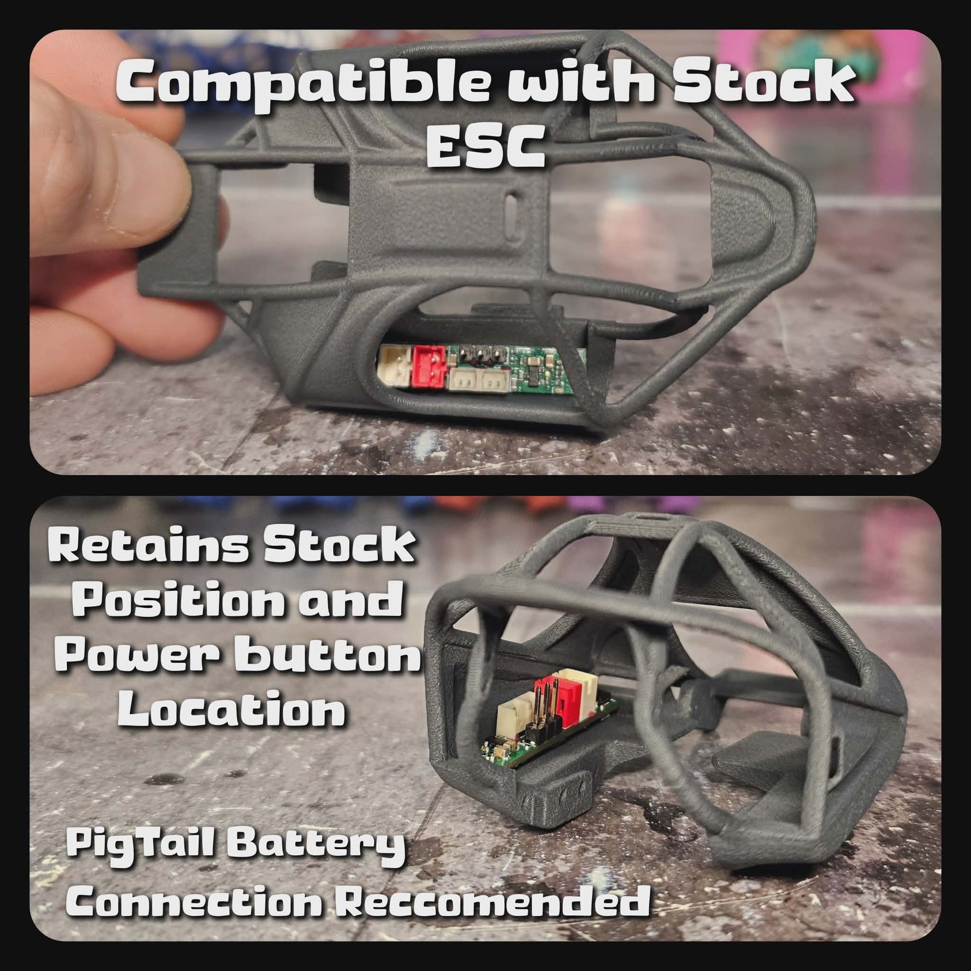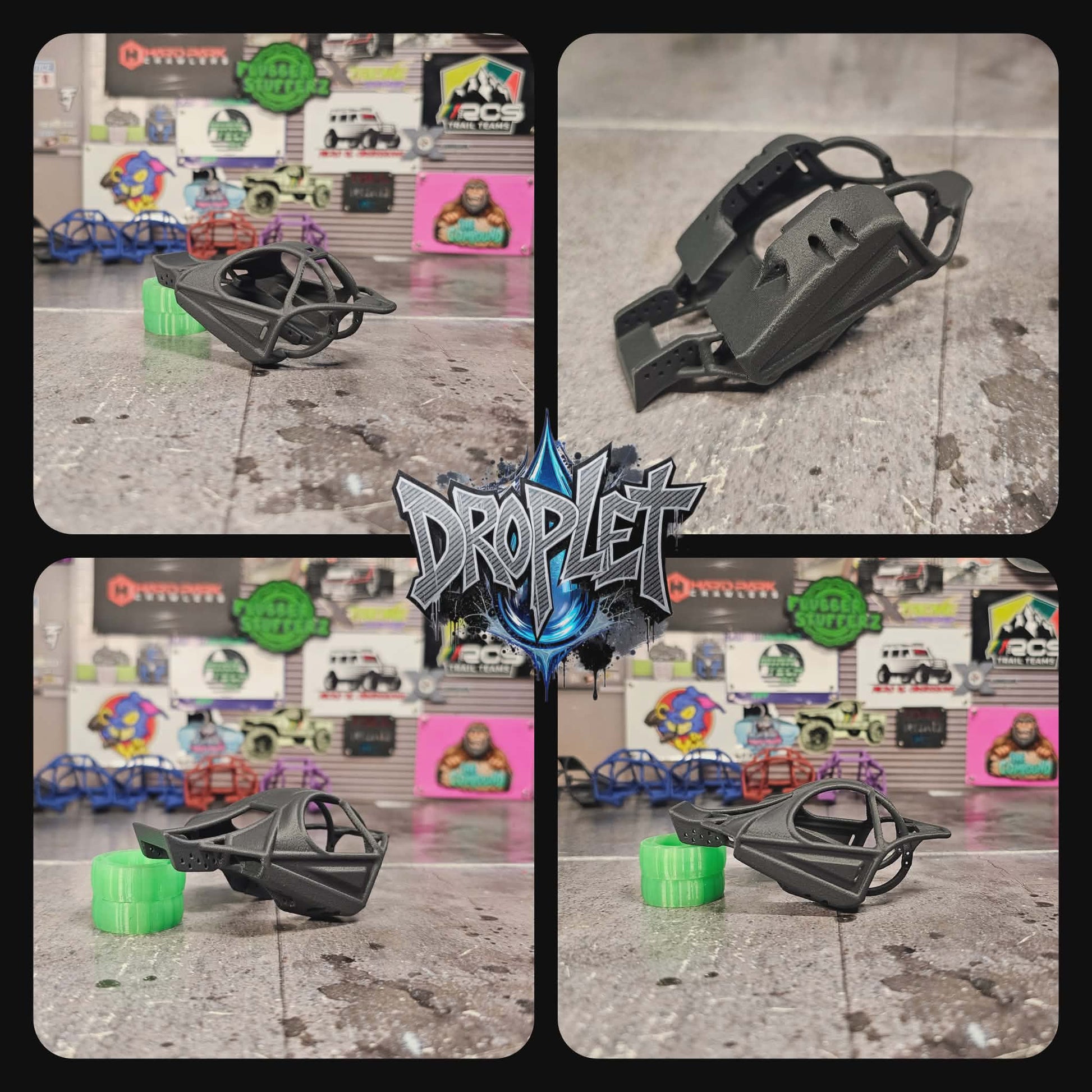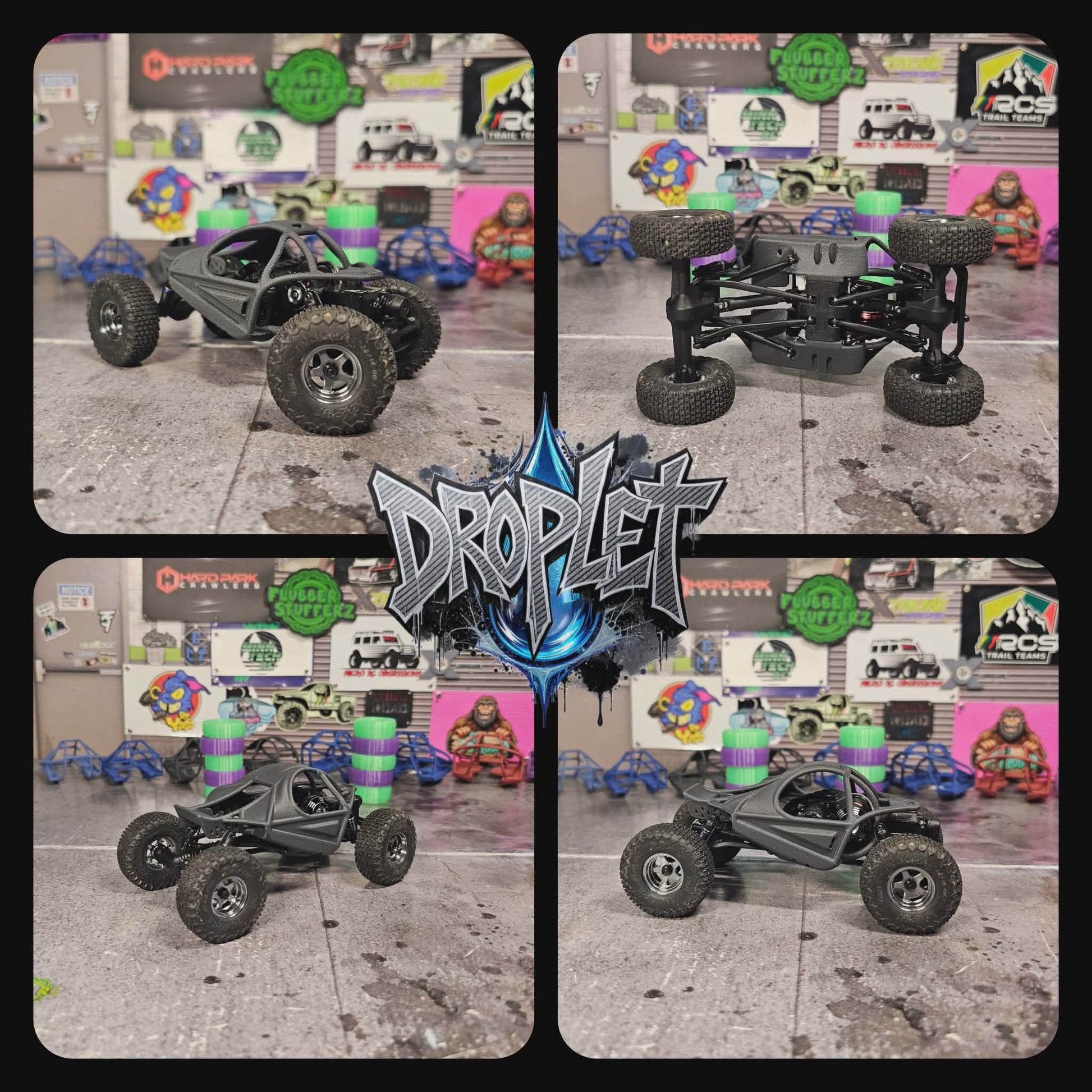 The Droplet is a ground-up tube chassis, taking our years of Body and Parts design, to push the limits and make something truly special. The foundation starts with our custom SCX30 flat skid set at 13 degrees. The skid has been narrowed and minimized with the upper links divorced . The lower links stay in a stock position, while we've divorced the uppers and have played with maxing clearences while keeping it balanced. Front upper link mounting has been widened by 4mm yet remains inboard. The rear uppers got the outboard treatment, retaining the stock links with no binding or clearance issues, while unlocking ultimate stability. Sliders have been drawn up to fit both stock and aftermarket electronics, keeping center of gravity low as possible. With shock positions fully tested, on both 21.5 and 25mm lengths, we have given additional spots for extended wheelbases in the future.